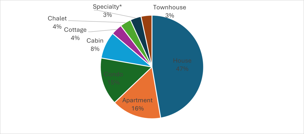 *Home types defined by host of short-term rental. Specialty units include: Barn; Boat; Castle; Dome house; Earth house; Farm stay; Farmhouse; Hut; Island; Lodge; Loft; Place; Shipping container; Tipi; Treehouse; Yurt