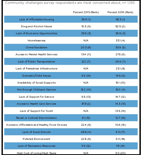Lack of affordable housing is the community challenge that survey respondents are most concerned about, according to the recently released 2016 Community Health Needs Assessment. Among survey respondents, 58.3 percent rated lack of affordable housing as the top concern, followed by 52.5 percent for drug and alcohol abuse.