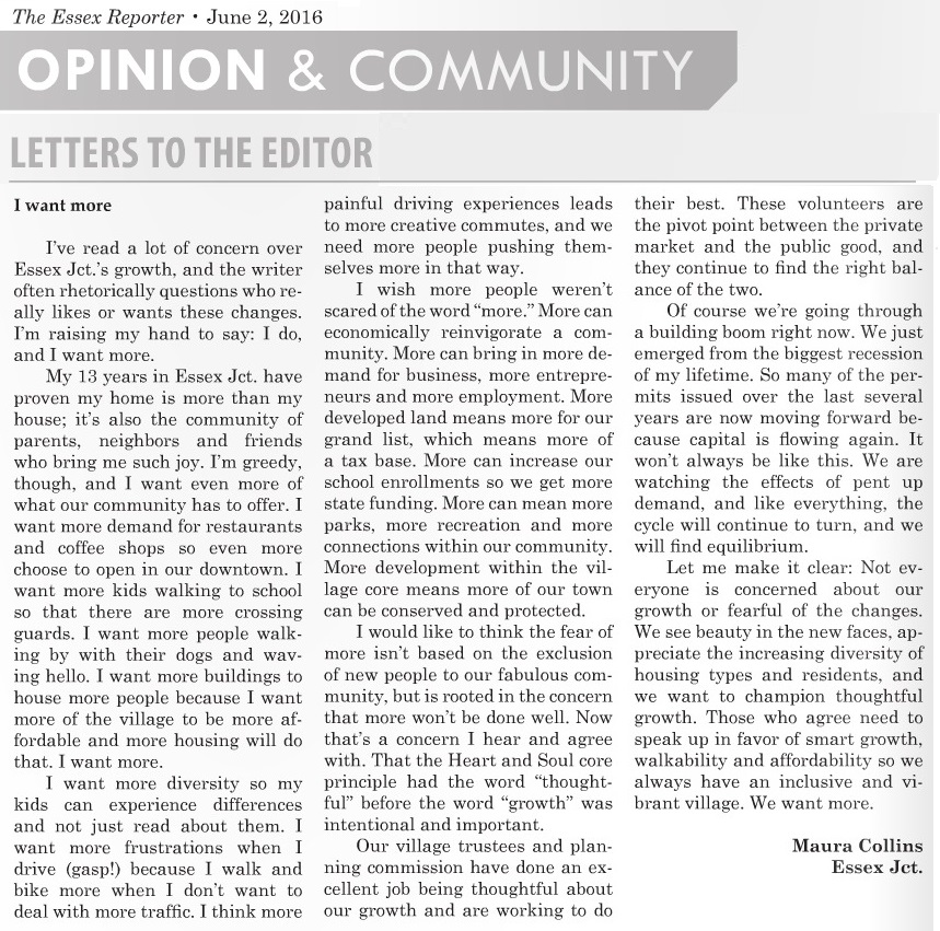 “I want more...” explains VHFA’s Director of Policy and Administration Maura Collins in a recent letter to the editor of the Essex Reporter. Collins is a long-time resident of Essex Junction who felt it was time to share her ideas about future expansion of the Junction’s housing stock and population.