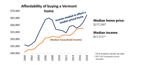 Vermont home prices reached new highs in 2018, continuing a four year trend of growth. However, household incomes have not kept pace, making it increasingly difficult for low and middle-income Vermonters to become homeowners.