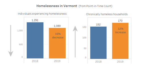 Newly released data from the 2019 Point-in-Time Count showed 1,089 people experiencing homelessness in Vermont on a single evening this winter, which represents a 16 percent decrease from last year.